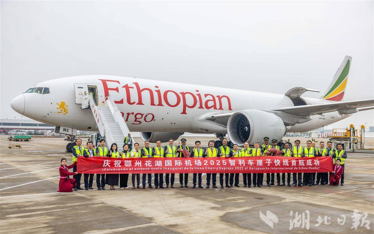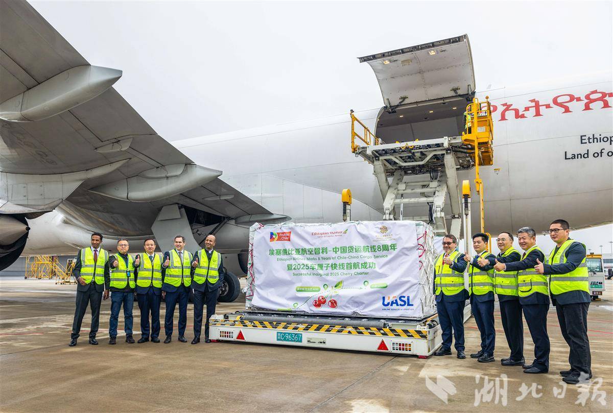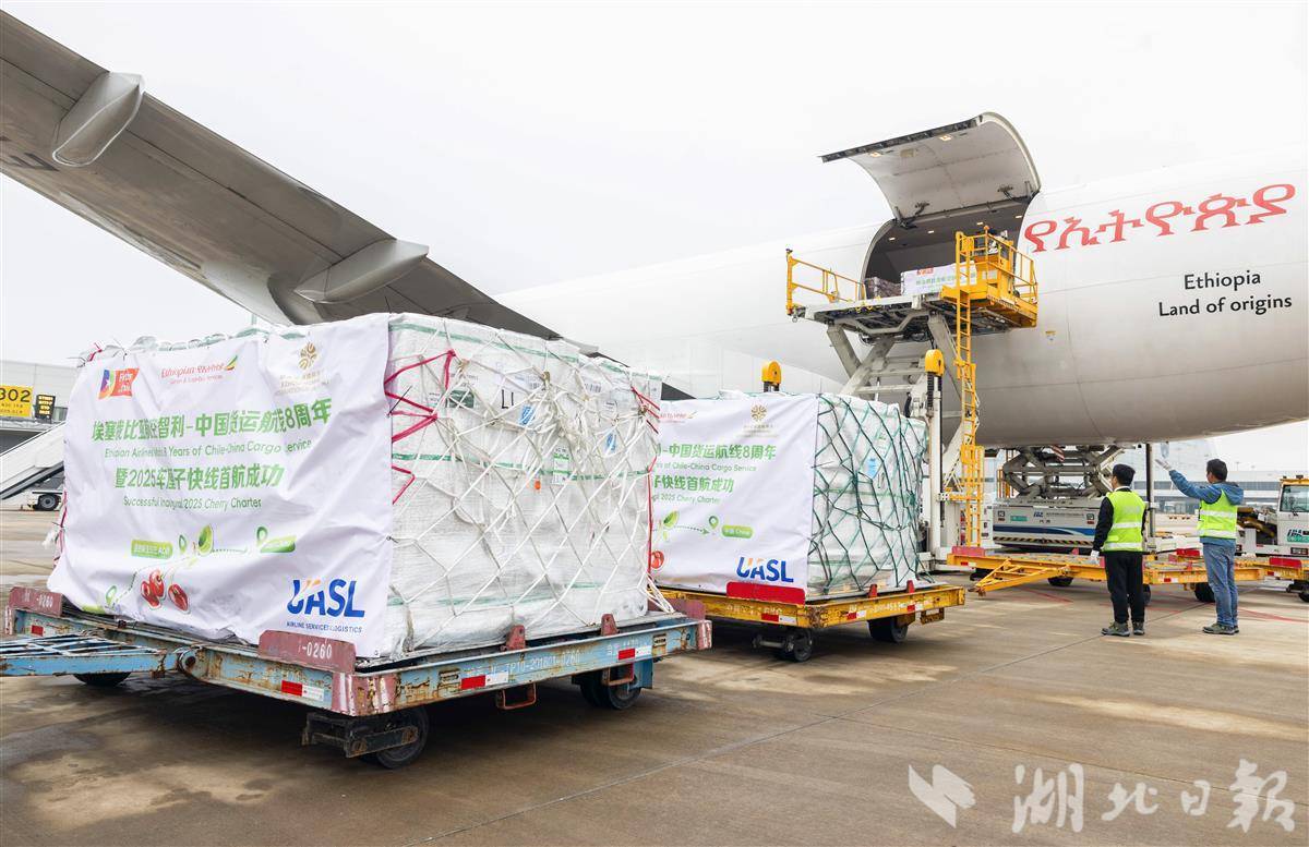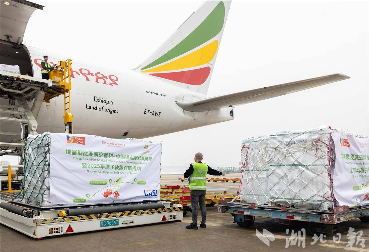 11月7日,一架埃塞俄比亚航空ET3690全货机顺利飞抵鄂州花湖国际机场。这是今冬首架抵达中国的智利车厘子包机,载有100吨新鲜甜美的智利车厘子,标志着花湖国际机场智利车厘子专线正式开通。