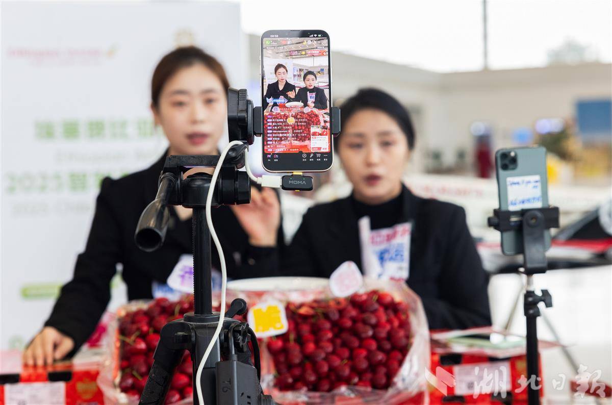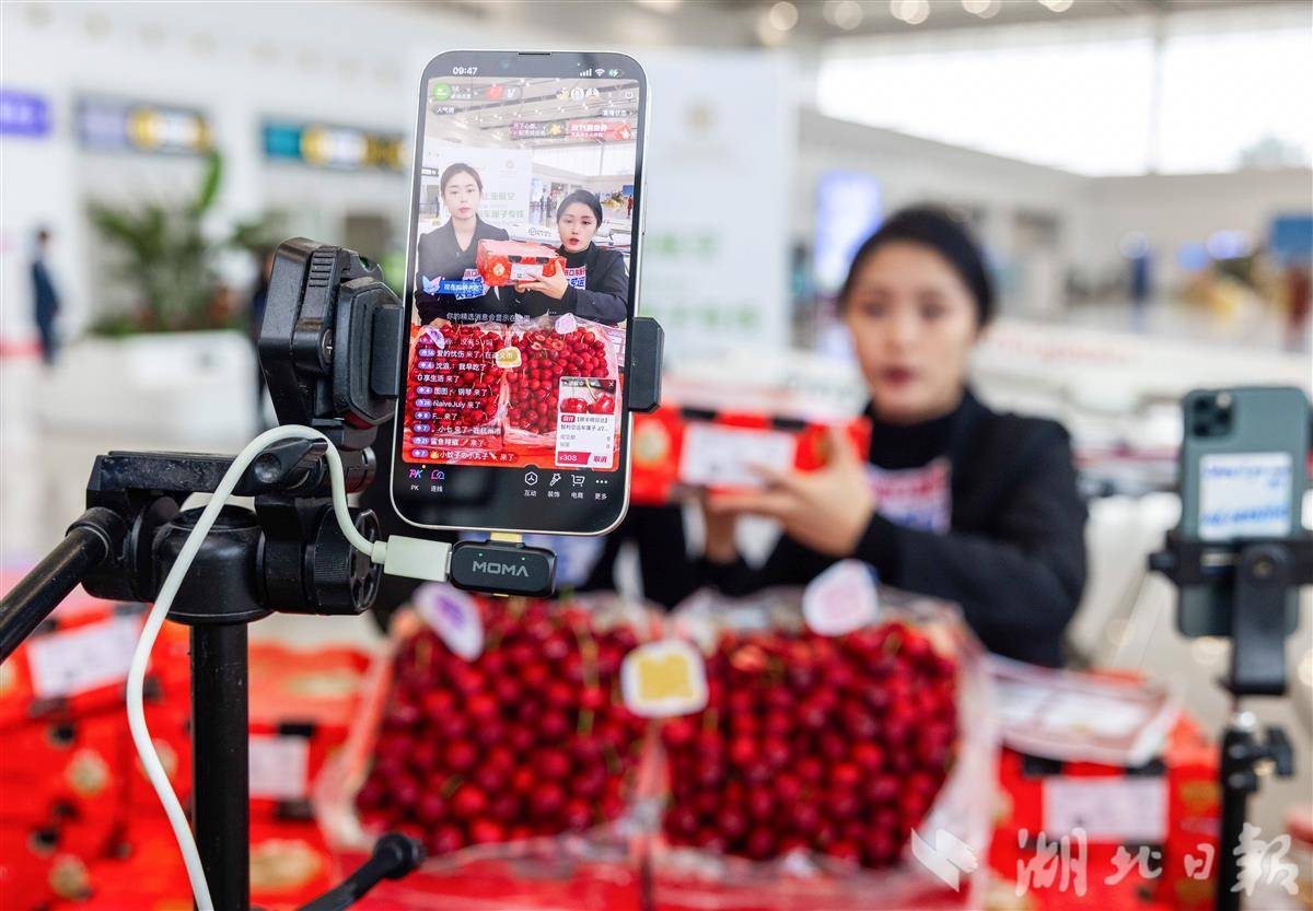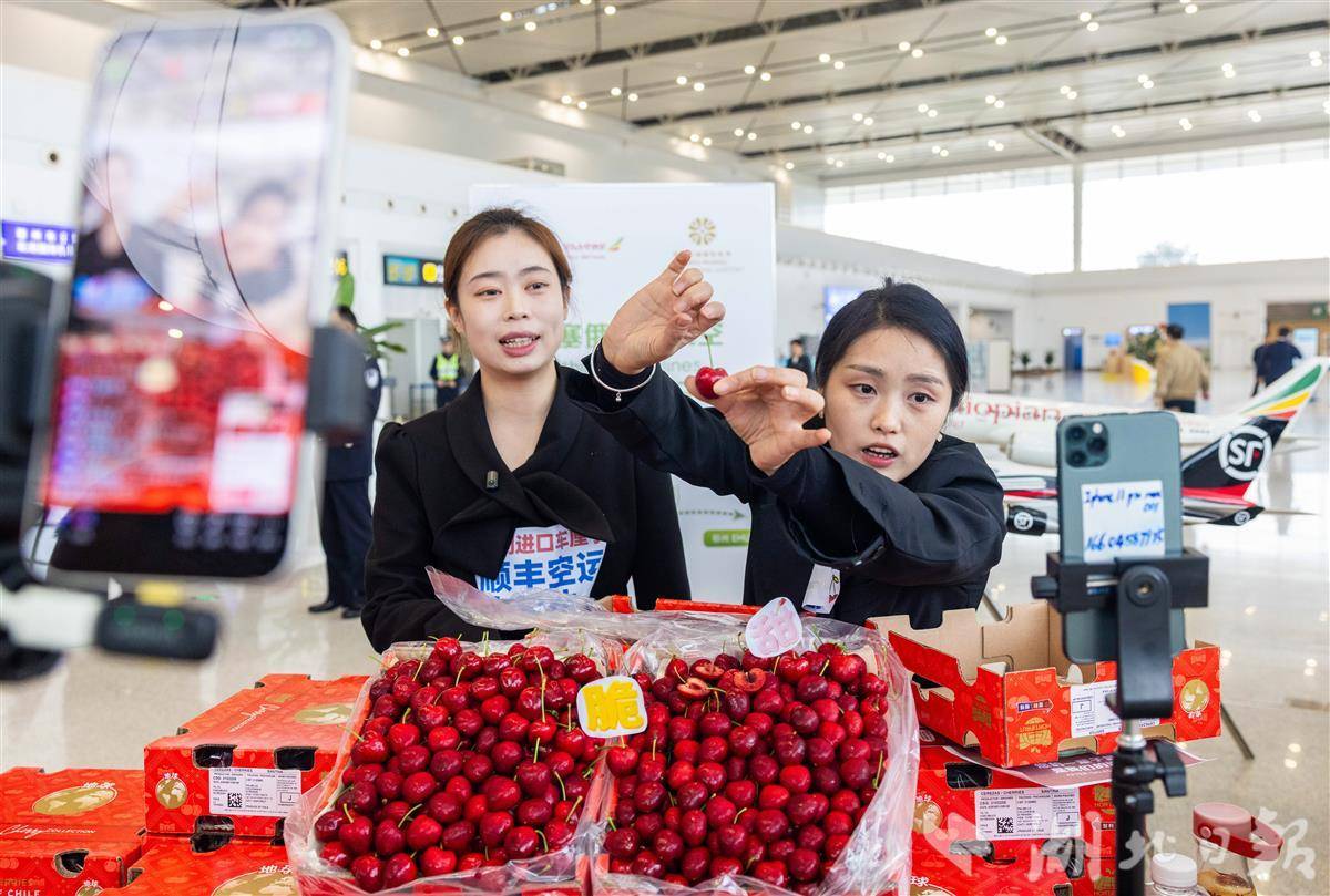 11月7日,花湖国际机场内,工作人员进行智利车厘子线上直播。
