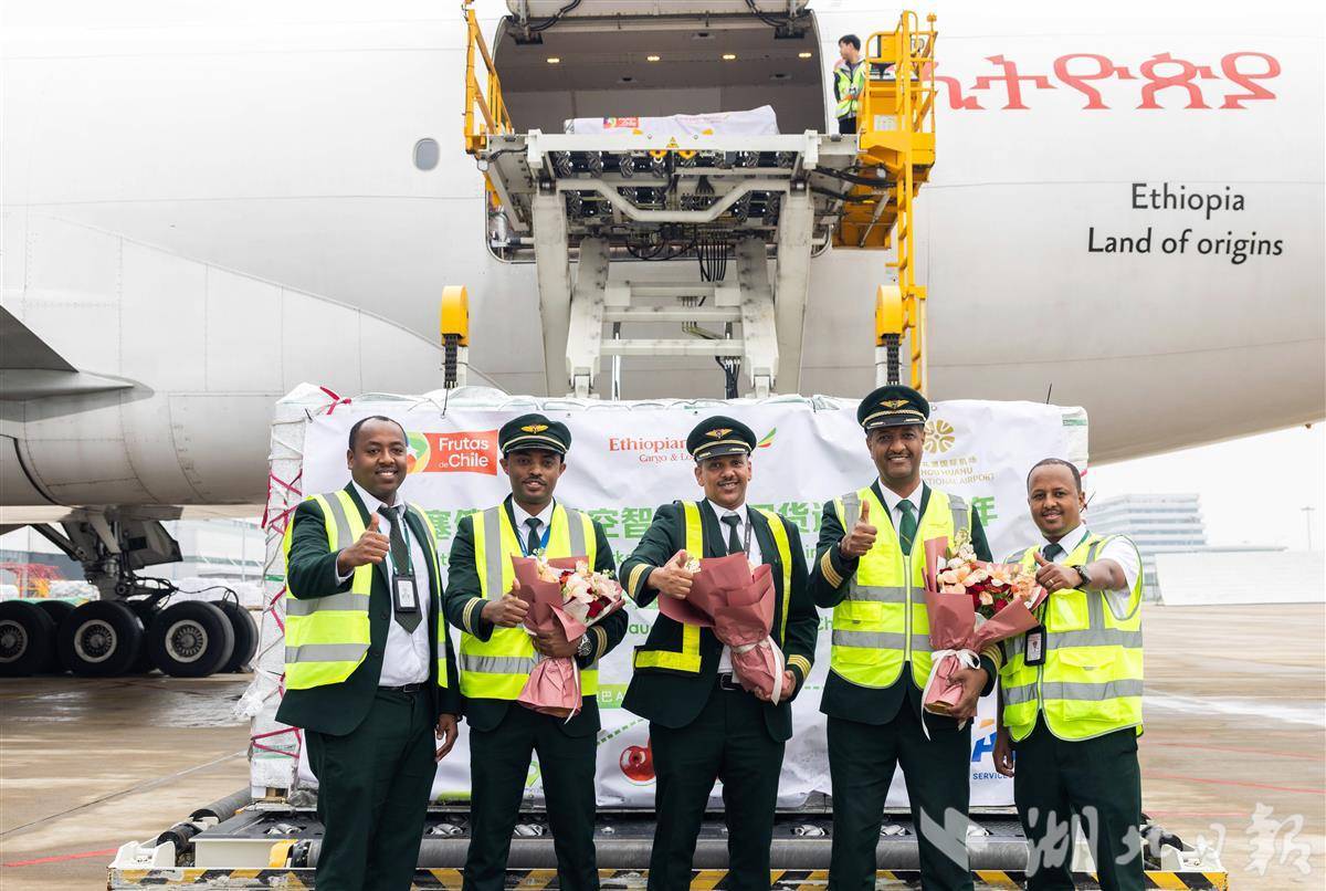 11月7日,载有100吨新鲜甜美智利车厘子的埃塞俄比亚航空ET3690全货机顺利飞抵花湖国际机场。图为机组人员与首箱车厘子合影。