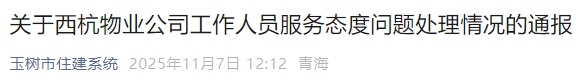 今天(11月7日)中午,记者从玉树市住建局获悉,该局已监督涉事物业公司主要负责人及涉事工作人员,向受辱业主当面赔礼道歉,扣除涉事工作人员半年绩效奖金及一个月工资,在全市范围内通报批评,并对该物业公司予以严厉警告。