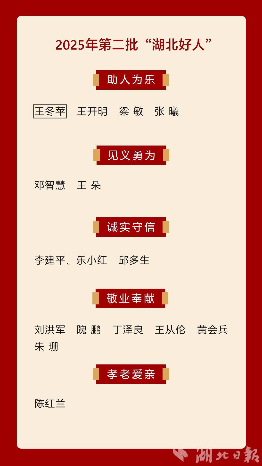现场发布的名单显示,全省共有15人(组)上榜2025年第二批“湖北好人”,其中助人为乐4人,见义勇为2人,诚实守信2人,敬业奉献6人,孝老爱亲1人。李建平、乐小红夫妻位列诚实守信好人榜单,并作为代表在现场登台领奖。主办方在致敬词中这样评价他们:一诺千金,心底无私,行动丈量诚信高度;千里寻亲,血浓于水,信义延续血脉温情。