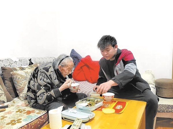 当查青胜到达舒婆婆家所在的楼层时,老人的家门照例虚掩着,可以直接进去。老人点的饭菜一顿吃不了,他帮忙分成两份,末了他又帮忙收拾餐桌、洗干净饭盒并带回幸福食堂。