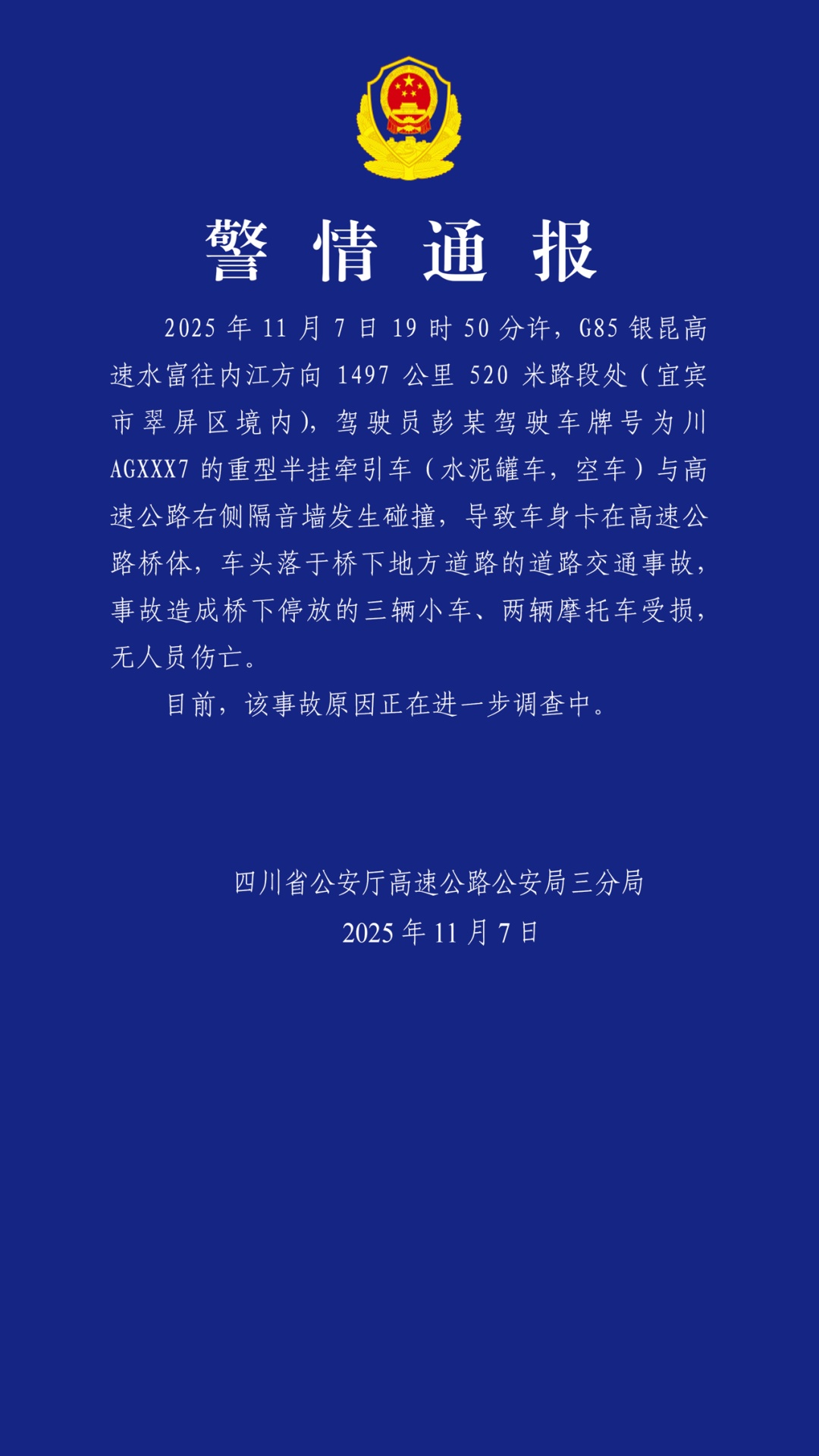 2025年11月7日19时50分许,G85银昆高速水富往内江方向1497公里520米路段处(宜宾市翠屏区境内),驾驶员彭某驾驶车牌号为川AGXXX7 的重型半挂牵引车(水泥罐车,空车)与高速公路右侧隔音墙发生碰撞,导致车身卡在高速公路桥体,车头落于桥下地方道路的道路交通事故,事故造成桥下停放的三辆小车、两辆摩托车受损,无人员伤亡。