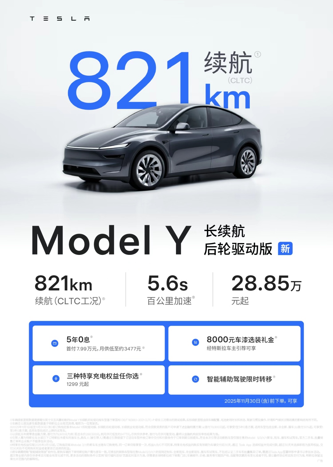 11月8日,特斯拉宣布Model Y长续航后轮驱动版正式上线。新车在CLTC标准下续航里程达到821公里,百公里加速时间为5.6秒。