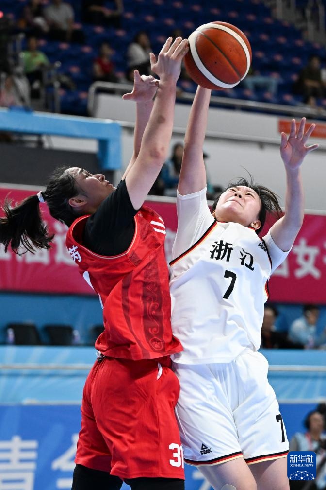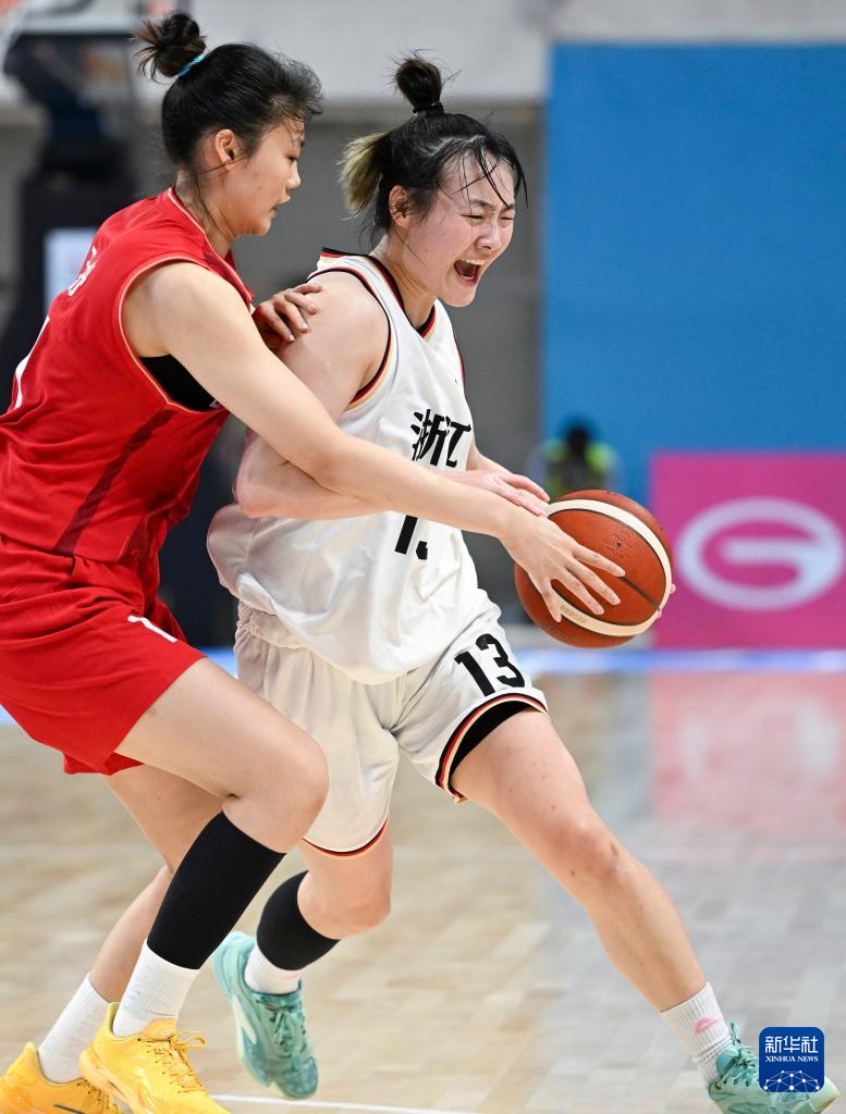 11月7日,浙江队球员张宇新(右)与山东队球员于嘉芮在比赛中抢篮板球。