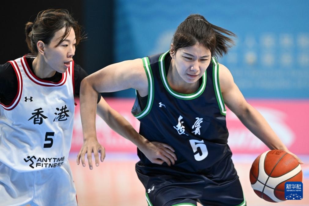 11月7日,香港队球员何珮盈(右)在辽宁队球员王焱的防守下进攻。