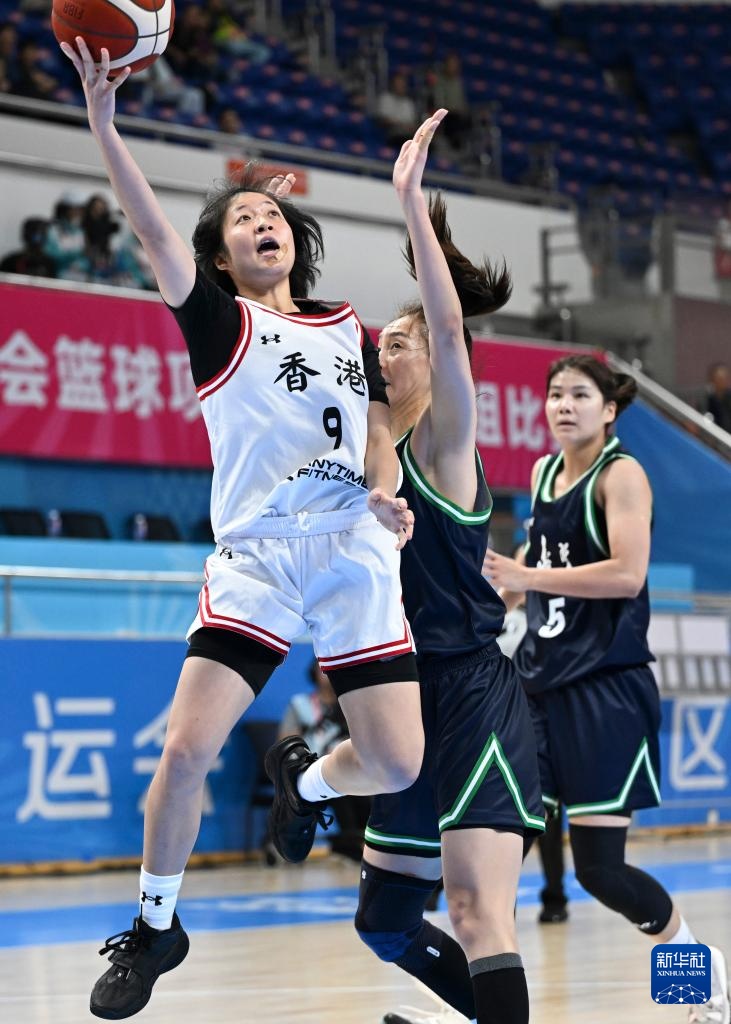 11月7日,香港队球员李佩沛(左)在比赛中上篮。