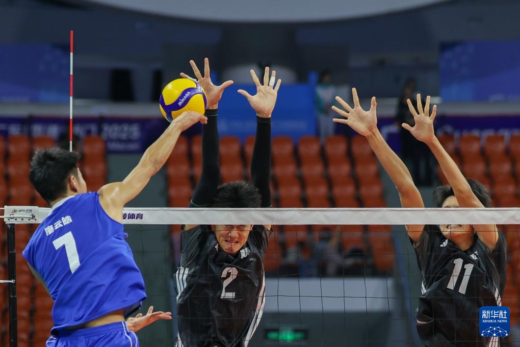 11月7日,广东队球员谷宗豪(左一)、佟欣宇(左二)、朱桂霆(右一)在比赛中拦网。