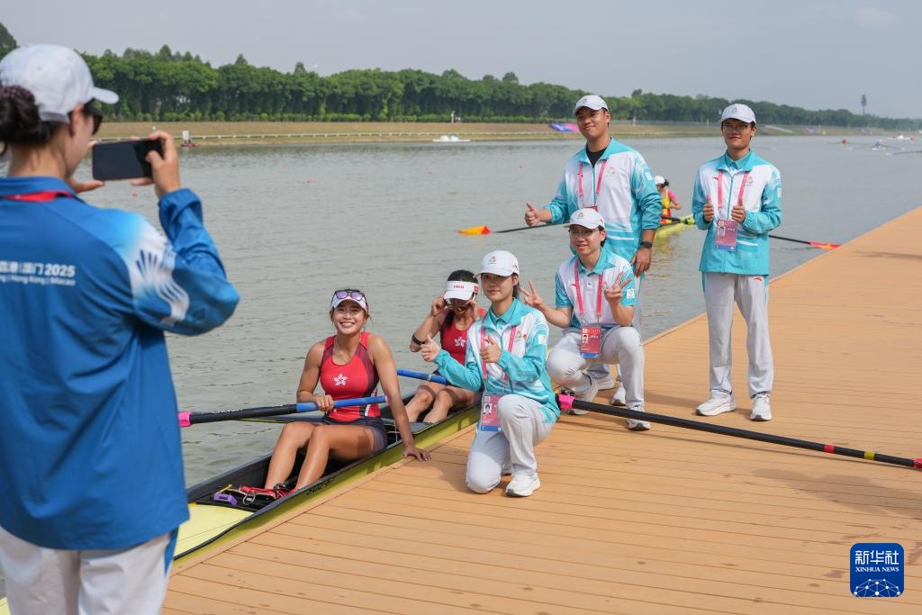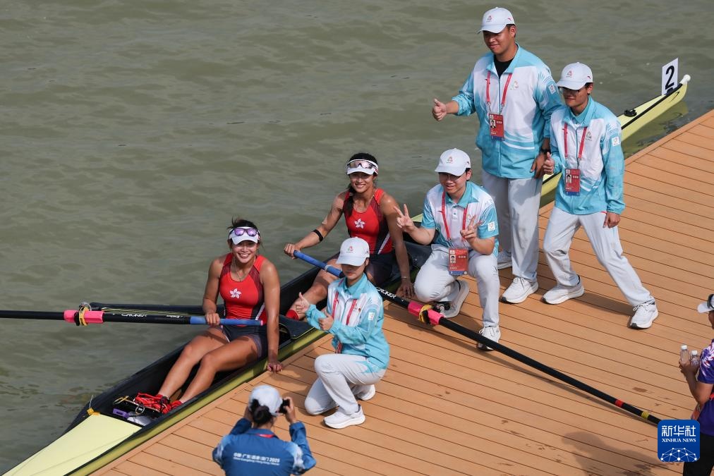 11月8日,香港队选手黄湘仪/梁琼允在女子双人单桨半决赛后与志愿者合影留念。香港队选手晋级决赛A组比赛。