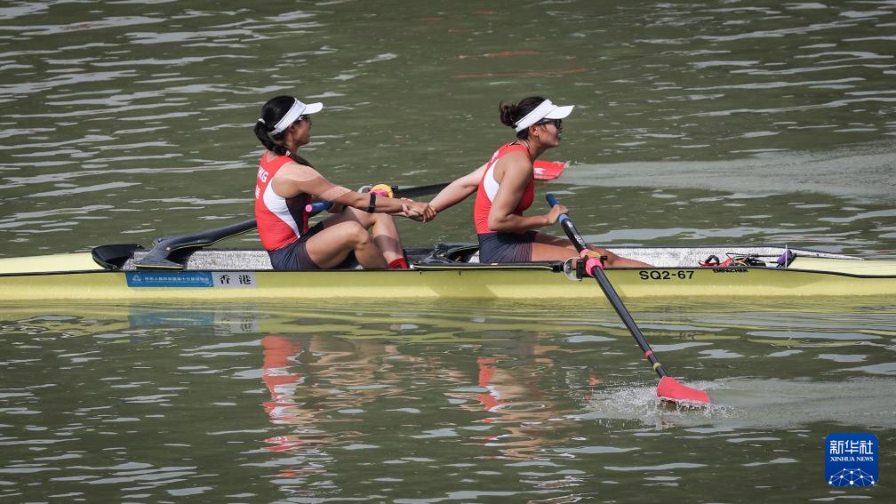 11月8日,香港队选手黄湘仪/梁琼允在女子双人单桨半决赛后庆祝。最终,她们晋级决赛A组比赛。
