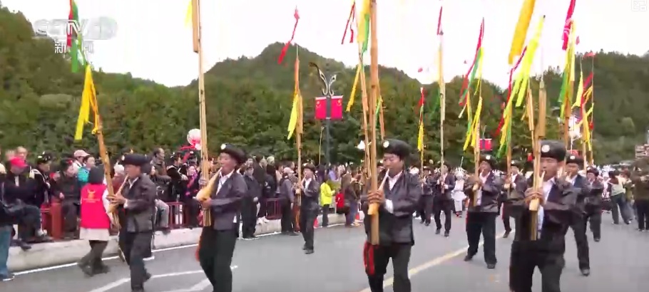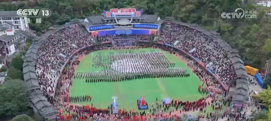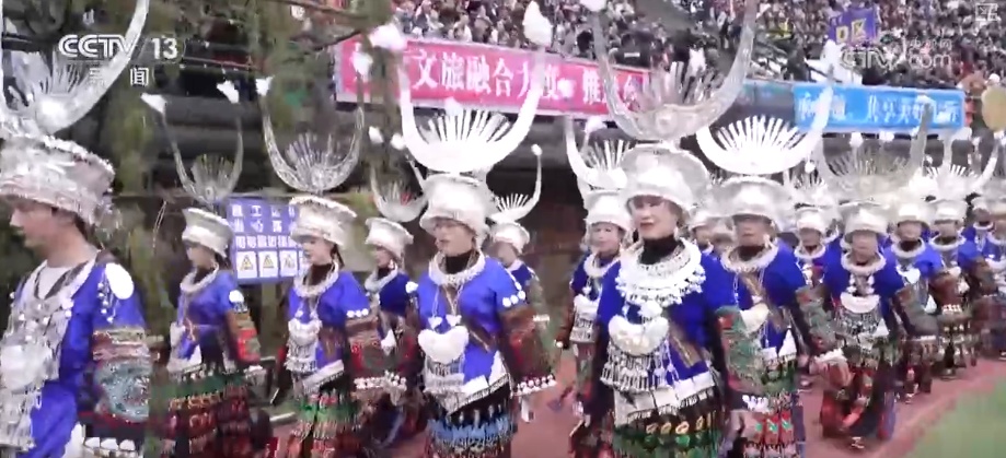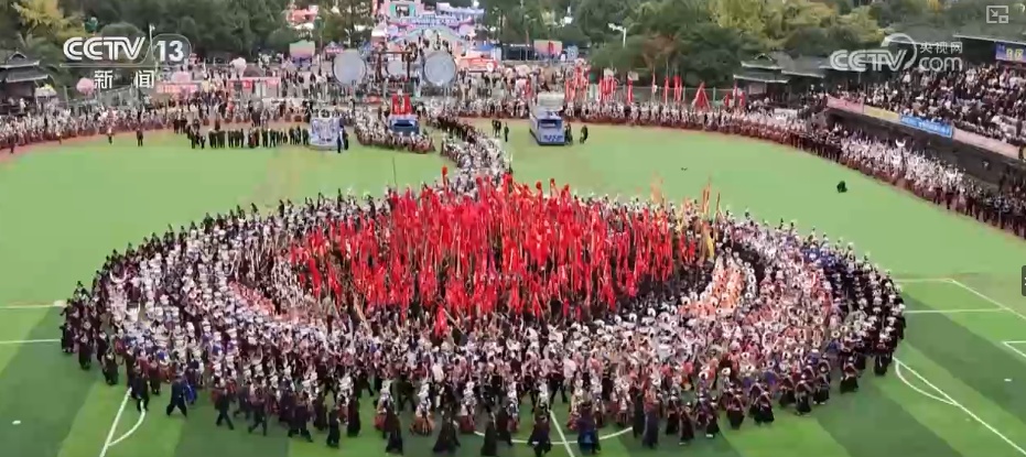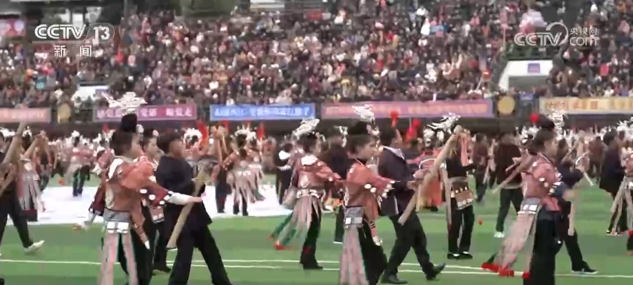 巡游队伍进入主会场后,依次演绎了《喜庆丰收》《多彩交织》《欢度苗年》《天籁之音》《团结奋进》等五大篇章。接近尾声时,所有参演群众边走边跳“芦笙团结舞”,圆圈越来越大,象征着共绘民族团结奋斗的“同心圆”。