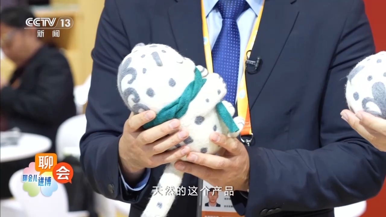 还有雪豹,是国宝,它也是用羊毛做的,天然材料制作的产品很受欢迎,所以我们今天也带到了今天进博会现场。