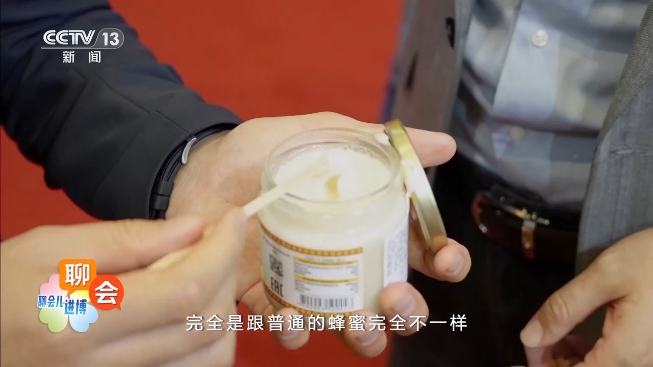 进博会吉尔吉斯斯坦国家馆商务负责人 吴晨曦:咱们这次从吉尔吉斯斯坦带来的农副产品中,特别想指出的是咱们这个天然蜂蜜。这个蜂蜜的品质和质量、营养取决于海拔,吉尔吉斯斯坦有的地方的海拔会达到3500米以上,比方说这是白蜂蜜。它的口感和普通的蜂蜜完全不一样。