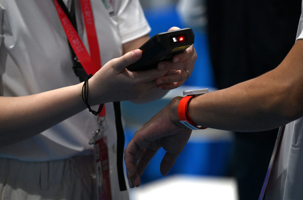 11月8日,志愿者为参赛选手佩戴通关手环。新华社记者 张晨霖 摄