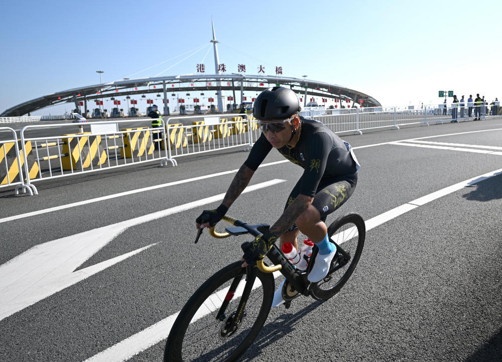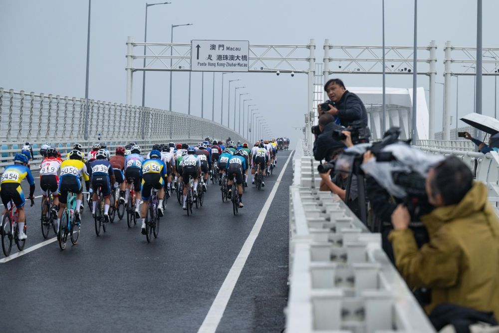 2024年11月24日,2024粤港澳公路自行车赛暨第十五届全国运动会公路自行车测试赛举行,图为参赛选手在澳门大桥骑行。新华社记者 张金加 摄