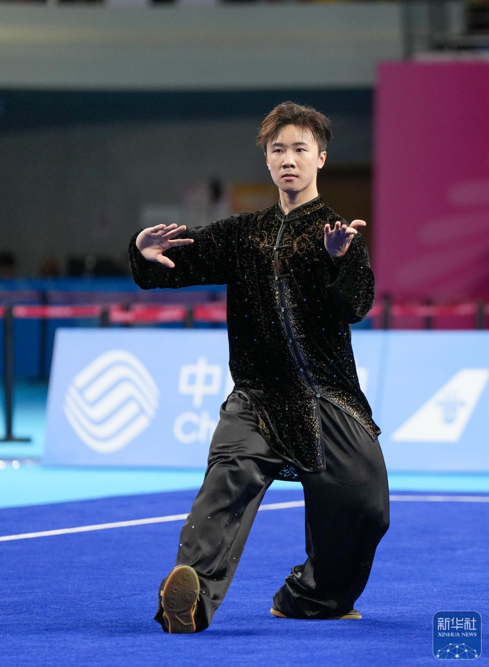 ↑ 福建队选手王彦宇在太极剑比赛中。最终,他获得亚军。 新华社记者 晋美多吉 摄