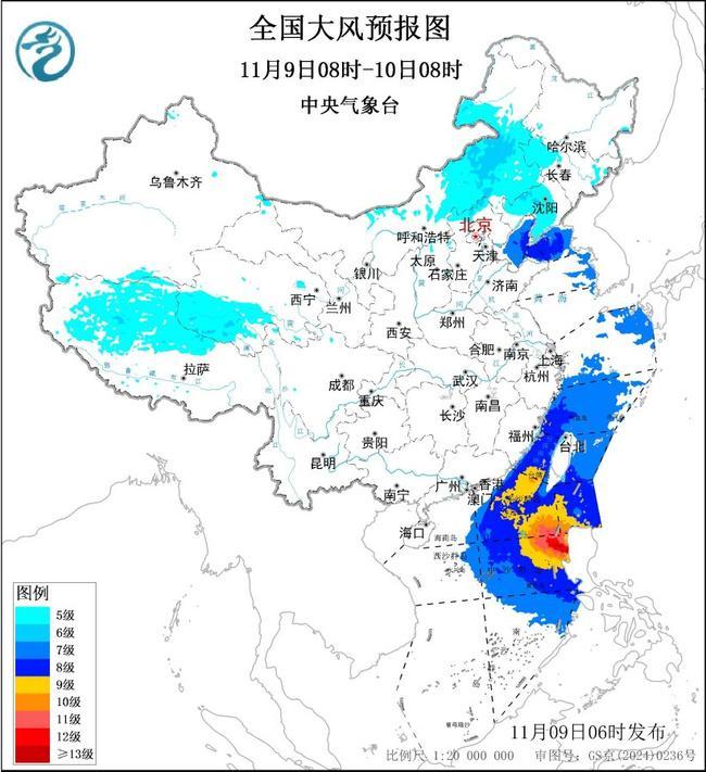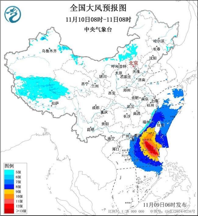 11月10日08时至11日08时,新疆北疆地区、内蒙古中部、西藏北部、青海西南部、福建东部和广东东部沿海地区等地的部分地区将有5~6级风,阵风7~8级。东海南部海域、台湾海峡、台湾以东洋面、巴士海峡、南海东部海域将有7~8级、阵风9~10级的大风,其中南海东北部和中东部海域的风力可达9~10级,阵风11~12级,台风“凤凰”中心经过的附近海域风力有11~13级,阵风14~15级。