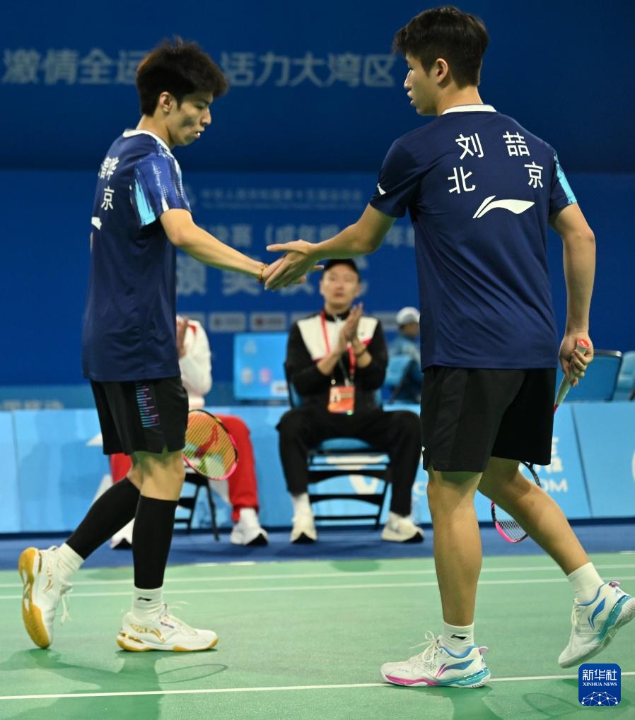 11月8日,北京队组合张智晔(右)/刘喆在男双比赛中。他们0比2不敌福建队组合陈永锐/魏简真。最终,北京队3比2战胜福建队,晋级下一轮。