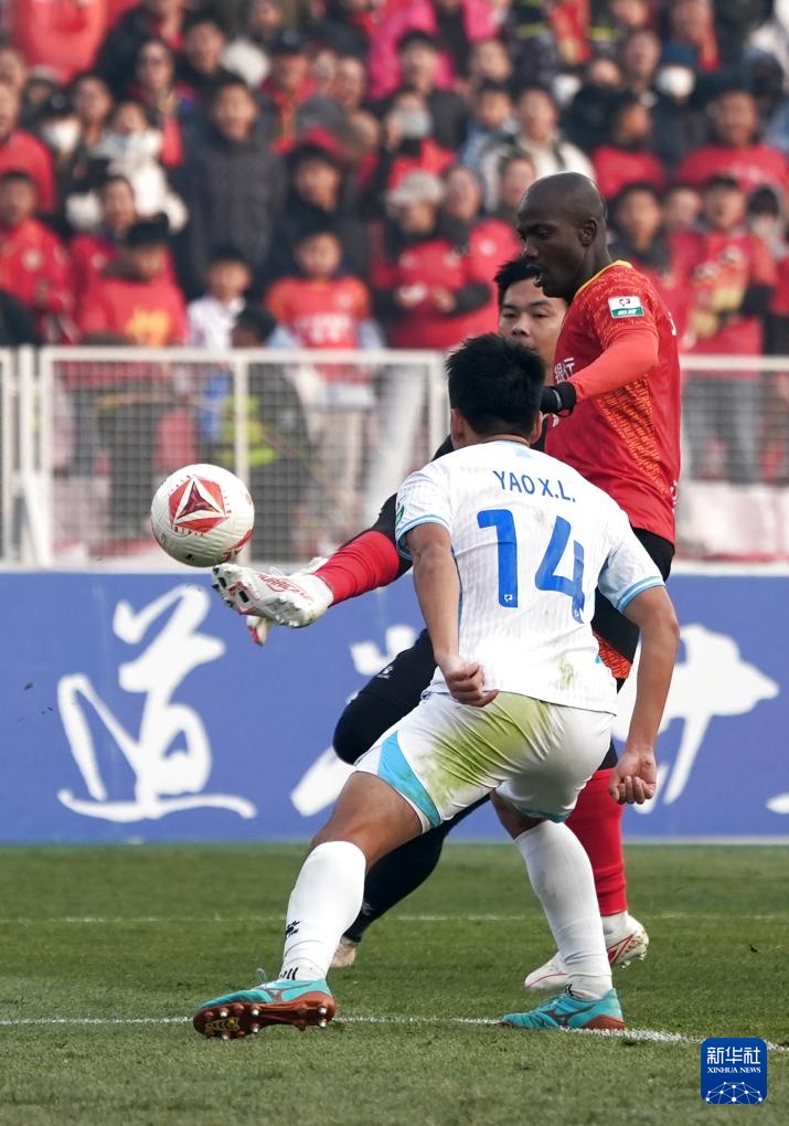 11月8日,辽宁铁人队球员邦本宜裕(右一)在比赛中射门得分。