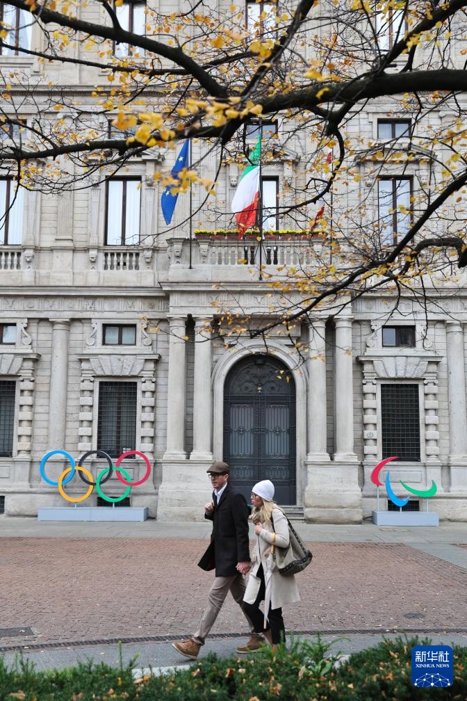 10月29日,人们经过米兰市政厅前的奥运会、残奥会会徽。