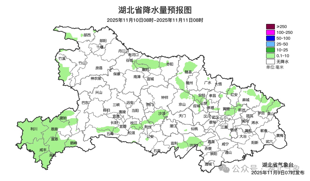 11月10日08时-11日08时,恩施地区阴天有小雨;其他地区阴天到多云,局地有零星小雨。最高气温西部13~16℃、中东部17~21℃,最低气温西部7~12℃、中东部12~14℃,偏北风3级、阵风4到5级。