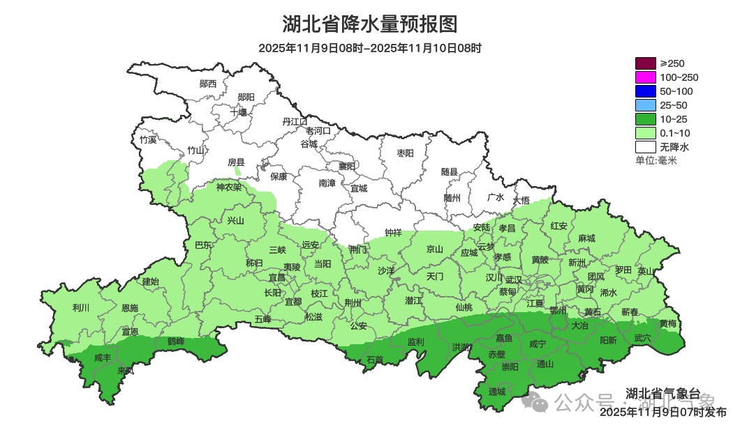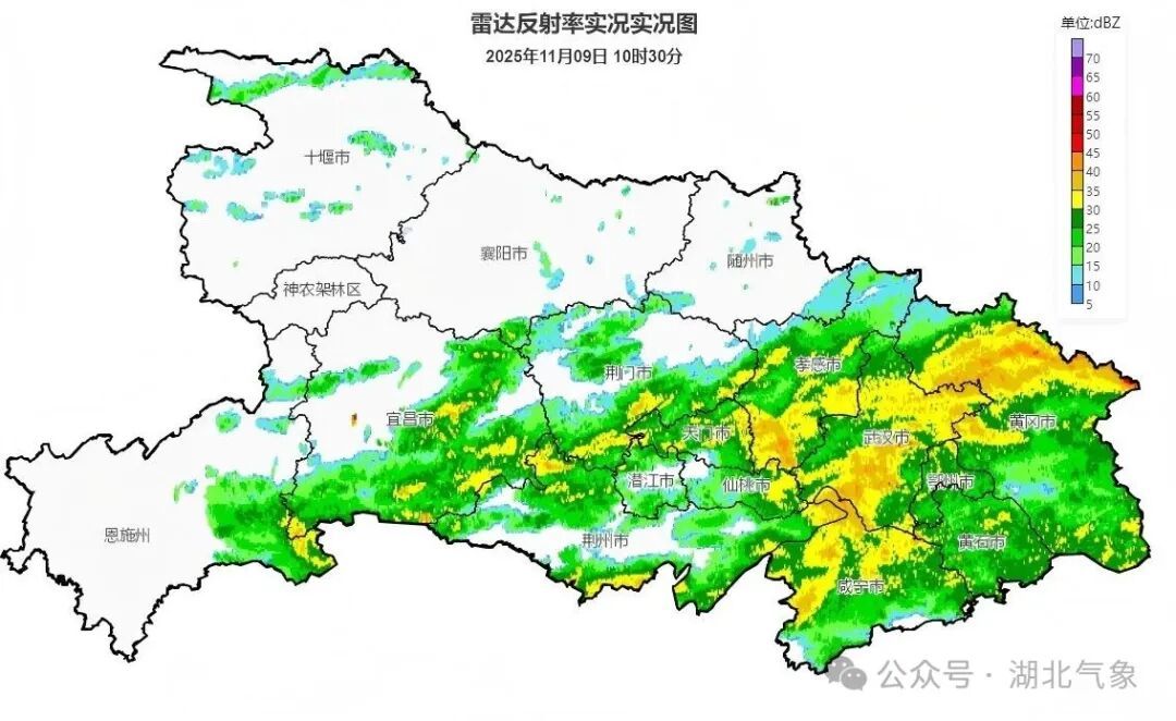 11月9日08时-10日08时,鄂西南、江汉平原、鄂东南阴天有小到中雨;鄂东北阴天有小雨;其他地区阴天,局地有零星小雨。最高气温14~18℃,最低气温西部9~13℃、中东部13~15℃,偏北风3级、阵风4到5级。