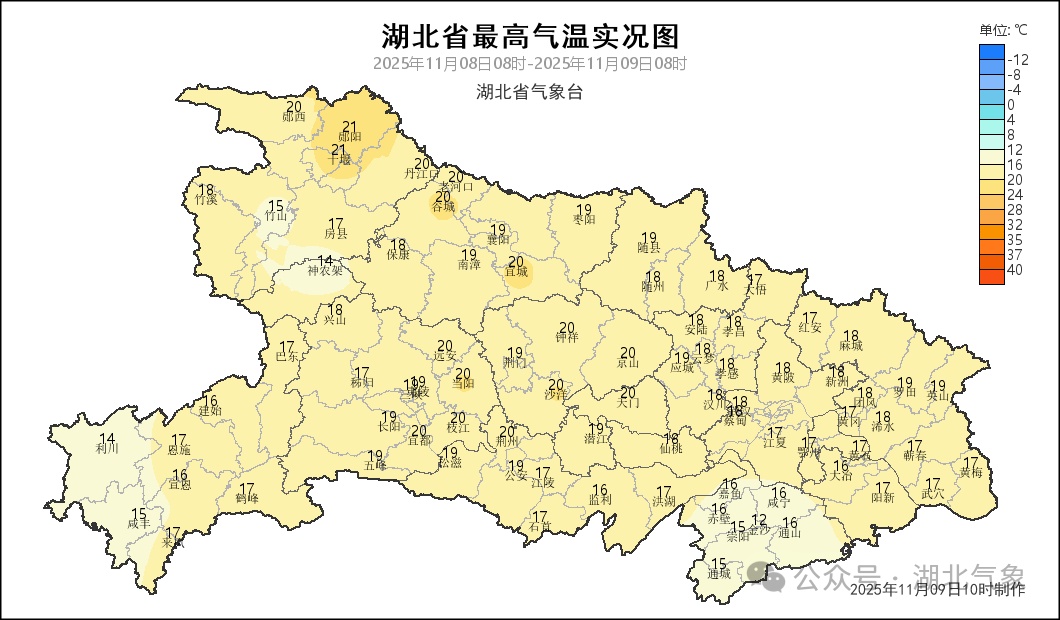 11月11日08时-12日08时,鄂西南阴天到多云;其他地区多云到晴天。最高气温18~22℃,最低气温西部6~10℃、中东部10~13℃,偏北风3到4级、阵风5到6级。