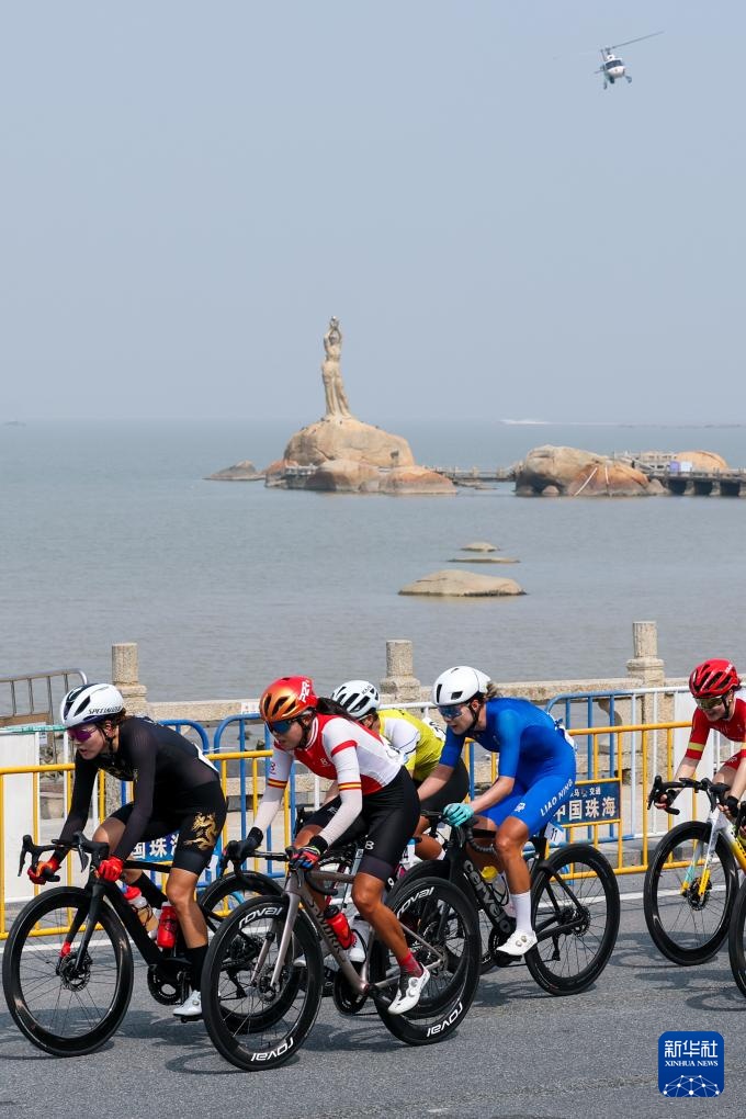 11月9日,参赛选手在比赛中经过珠海城市地标景观“珠海渔女”。