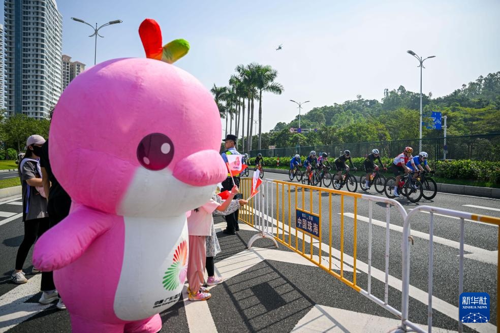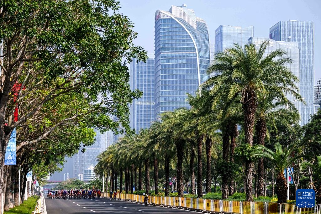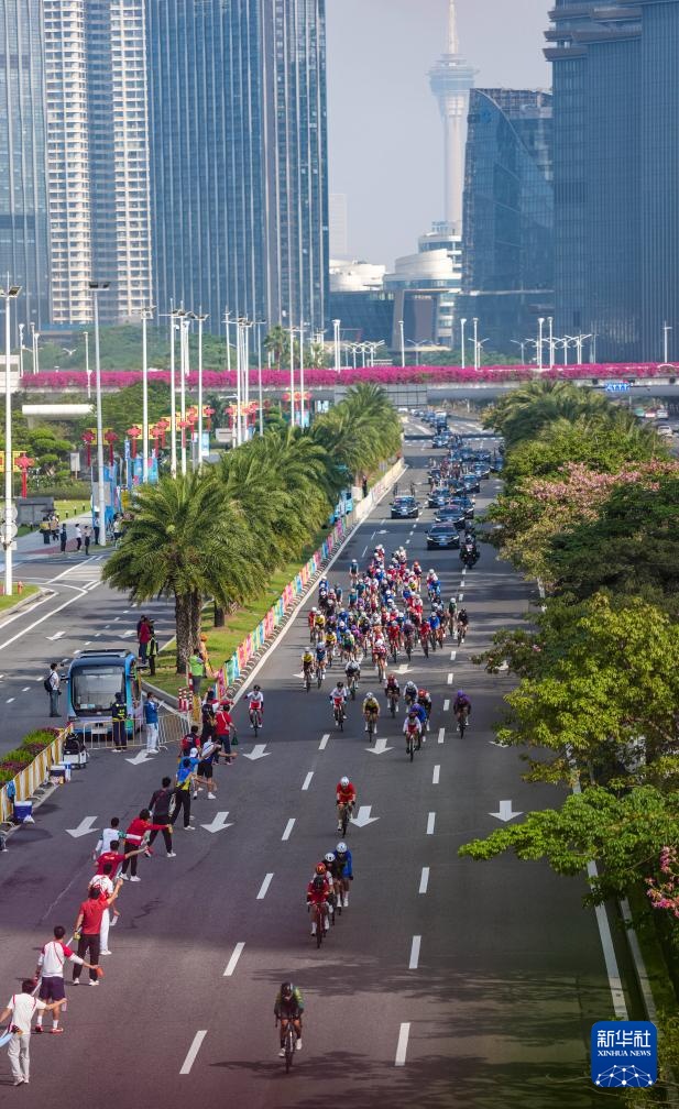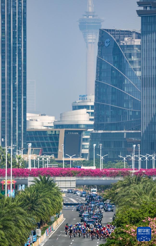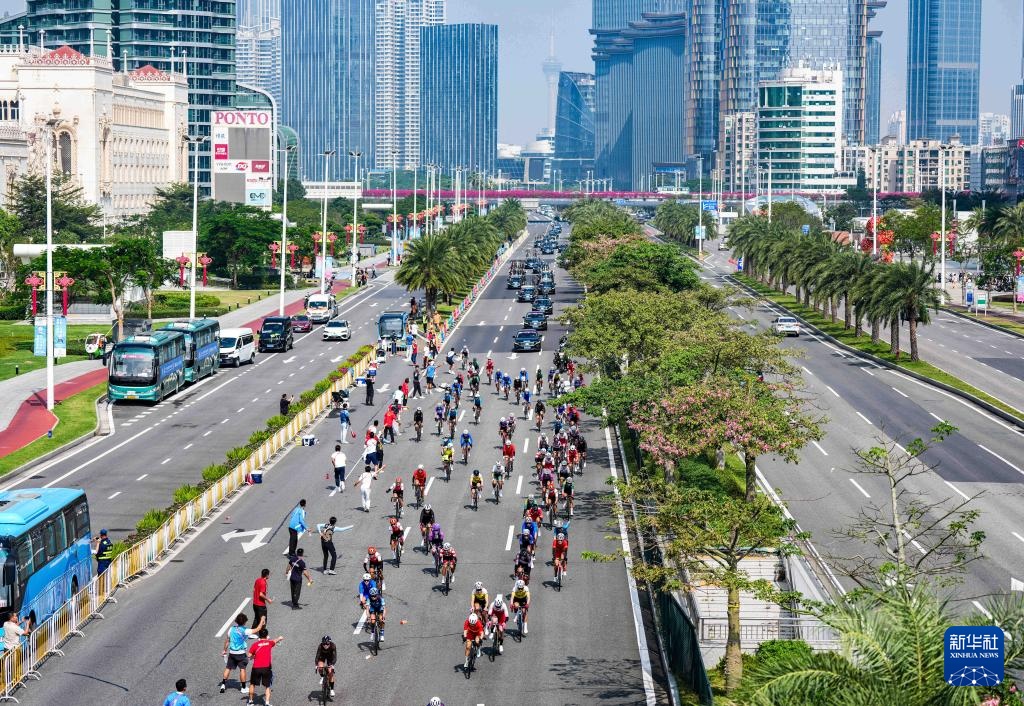 11月9日,参赛选手在比赛中途经横琴粤澳深度合作区的城市道路。
