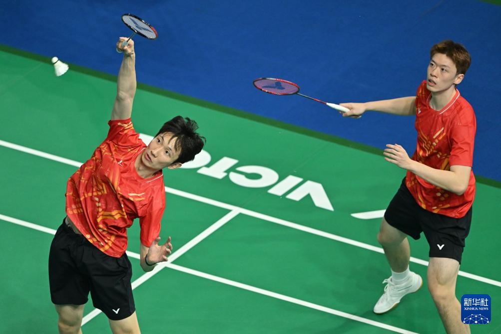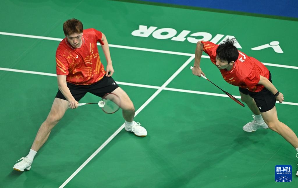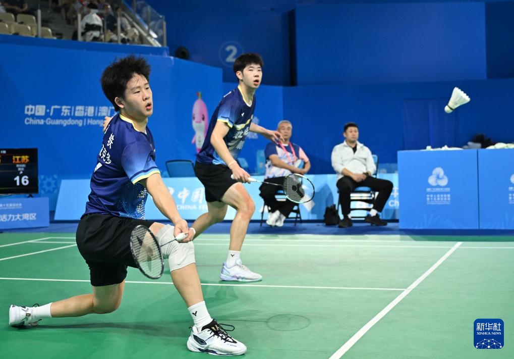11月9日,江苏队组合陈柏阳/黄荻(左)在双打比赛中。他们2比0战胜湖北队组合林轶/陈治国。