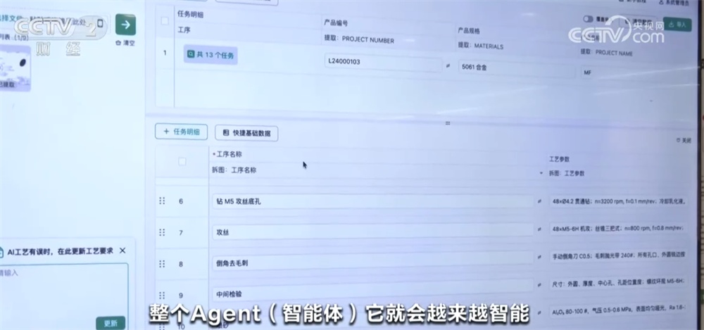 黑湖科技工作人员任永强称:“根据这张图纸,它可以把所有的工序、每个工序对应的工艺、一些工艺的参数尺寸全部拆解出来,把这些经验内化到智能体里面,整个Agent(智能体)就会越来越智能。”