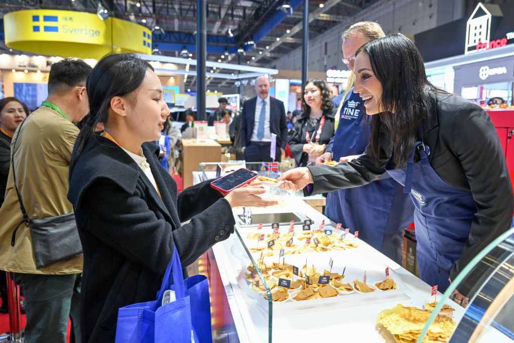 2025年11月7日,国家会展中心(上海),挪威国家馆,挪威农业和食品部国务秘书汉娜-贝里特·布瑞克为来宾派发以挪威棕色奶酪制作的华夫饼。澎湃新闻记者 朱伟辉 图