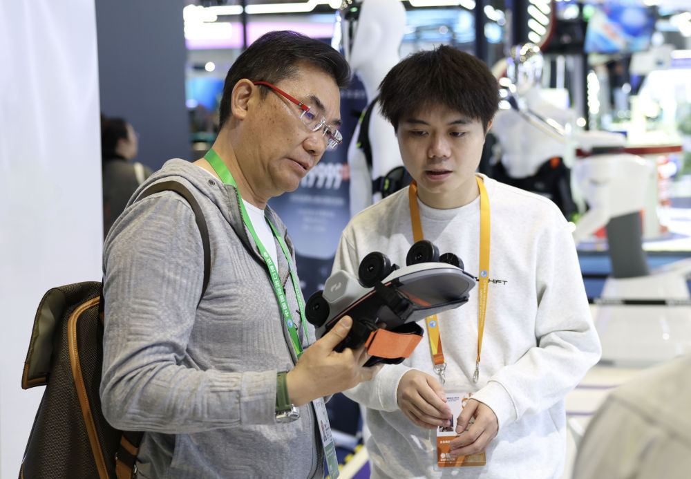 11月5日,观众在第八届进博会国家展中国馆了解非侵入式脑机接口机器人。新华社记者 丁赫 摄