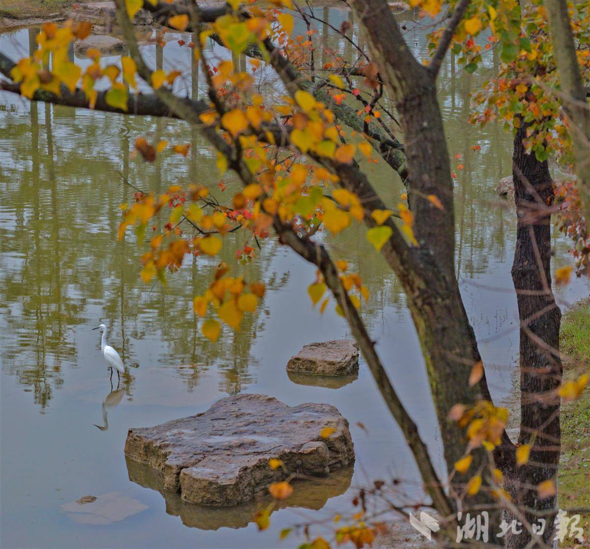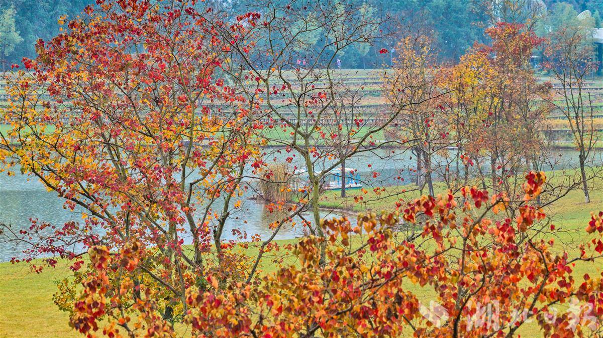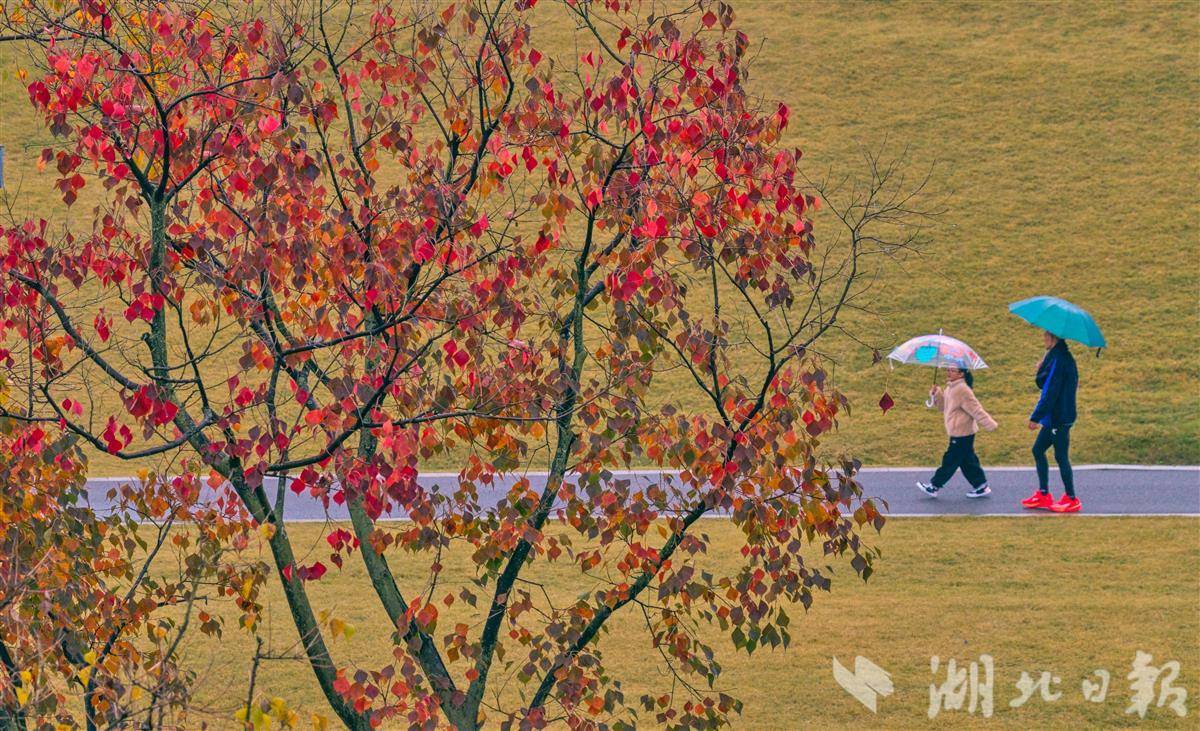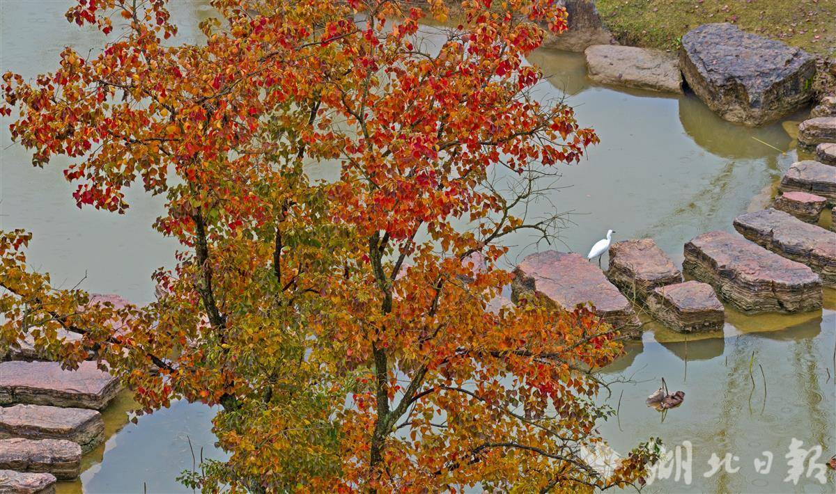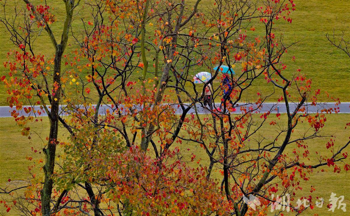 11月9日清晨,宜昌卷桥河湿地在绵绵秋雨中更显静谧雅致,浓郁秋意浸润着每一处景致。湿地内的乌桕树褪去翠绿,枝叶间缀满嫣红,如天然织就的暖色锦缎,成为秋日里最亮眼的景致。