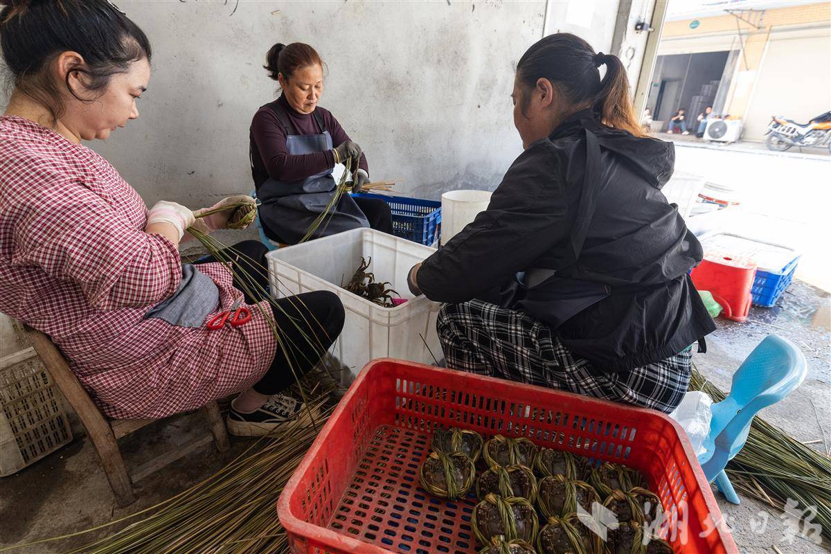 图为商户用草挽成绳绑扎螃蟹。