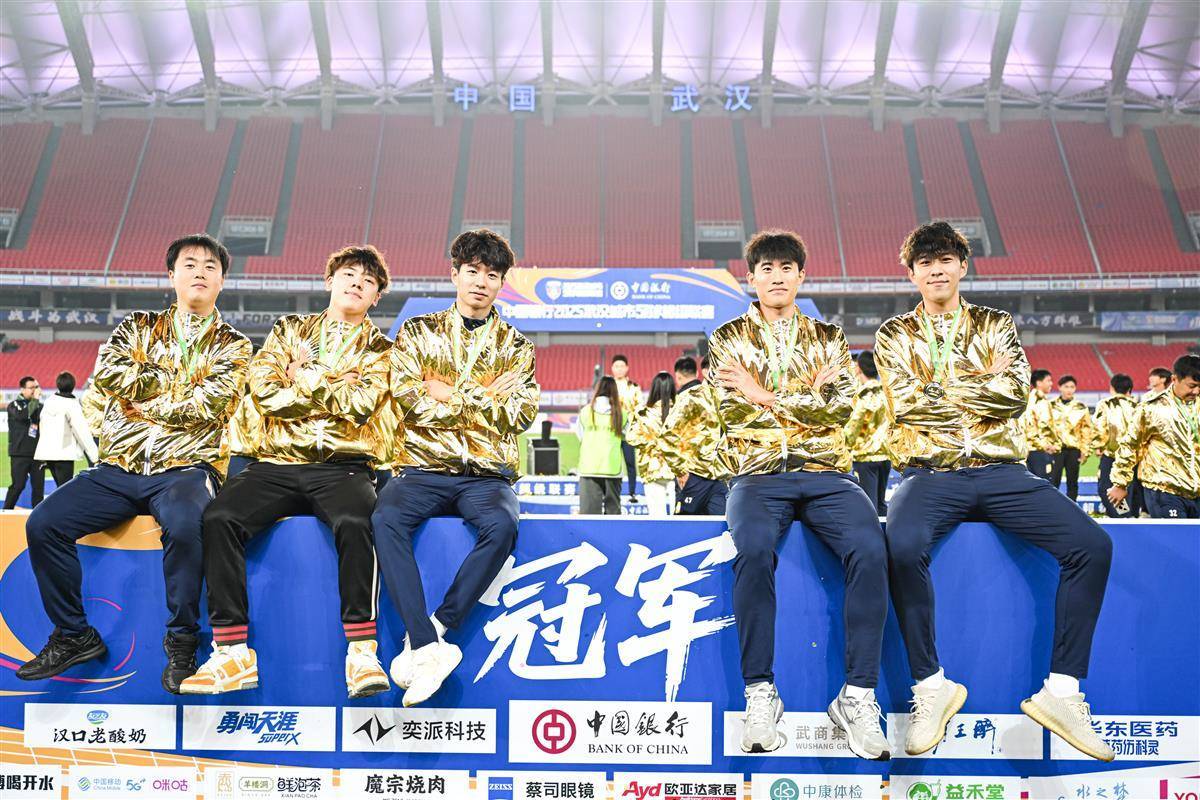 11月9日,2025武汉城市足球超级联赛(简称“汉超”)总决赛暨颁奖仪式在武汉体育中心主体育场举行,武汉体育学院队捧起“汉超”高校组冠军奖杯。(湖北日报全媒记者 任勇 通讯员 周光桢 宋善金 摄)
