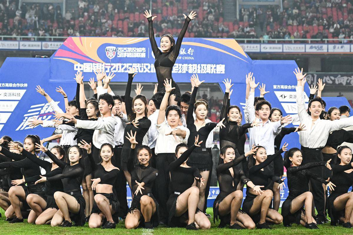 11月9日,2025武汉城市足球超级联赛(简称“汉超”)颁奖仪式在武汉体育中心主体育场举行。在颁奖仪式前,伴随着动感的音乐,来自武汉体育学院艺术学院的学生代表们为现场球迷带来舞狮《福满金秋》和摩登舞《龙蹴华章》,引来现场球迷阵阵欢呼。(湖北日报全媒记者 任勇 通讯员 宋善金 黄弋珂 摄)