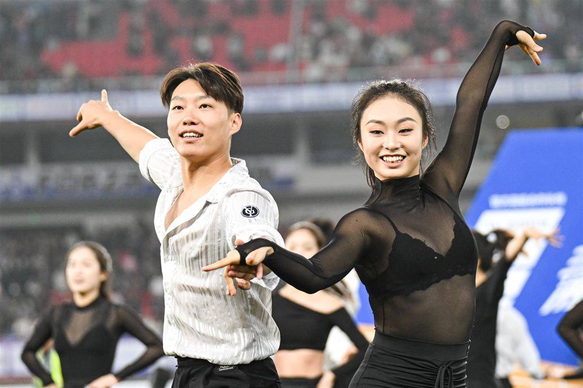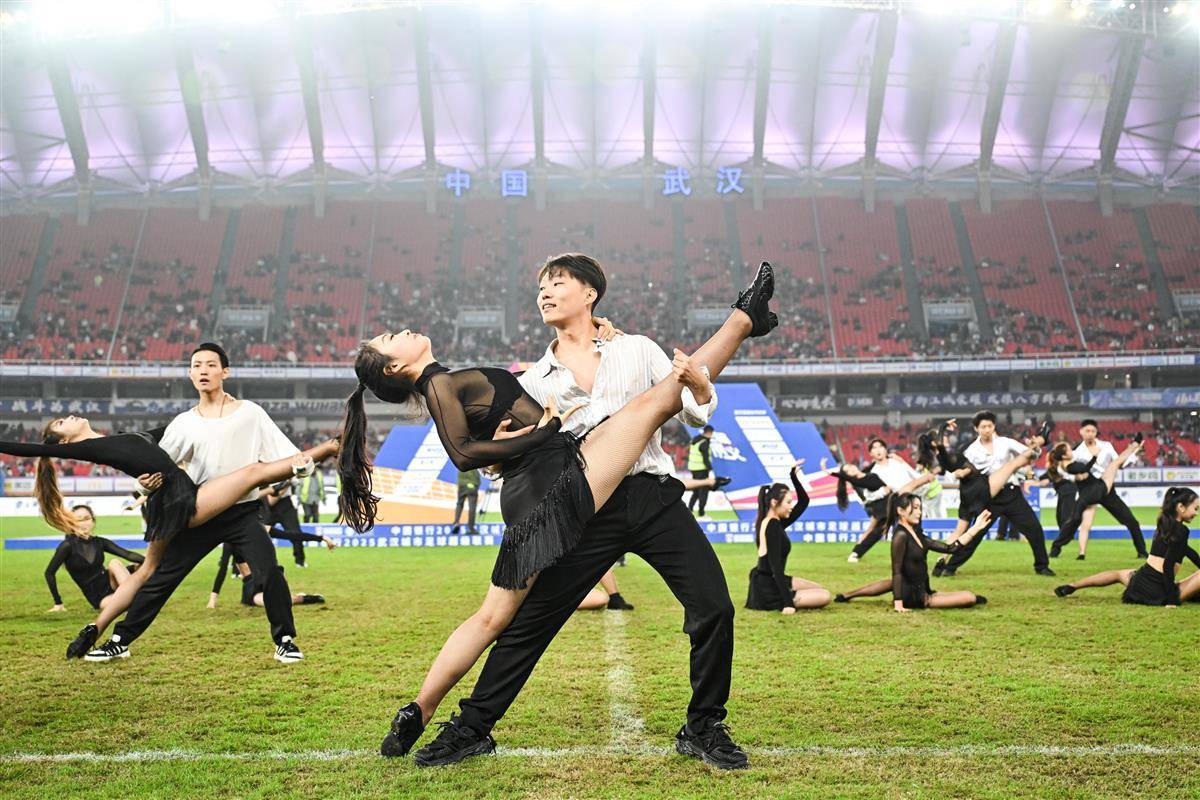 11月9日,在“汉超”颁奖仪式前,来自武汉体育学院艺术学院的学生代表们为现场球迷带来摩登舞《龙蹴华章》,引来现场球迷阵阵欢呼。(湖北日报全媒记者 任勇 通讯员 宋善金 黄弋珂 摄)