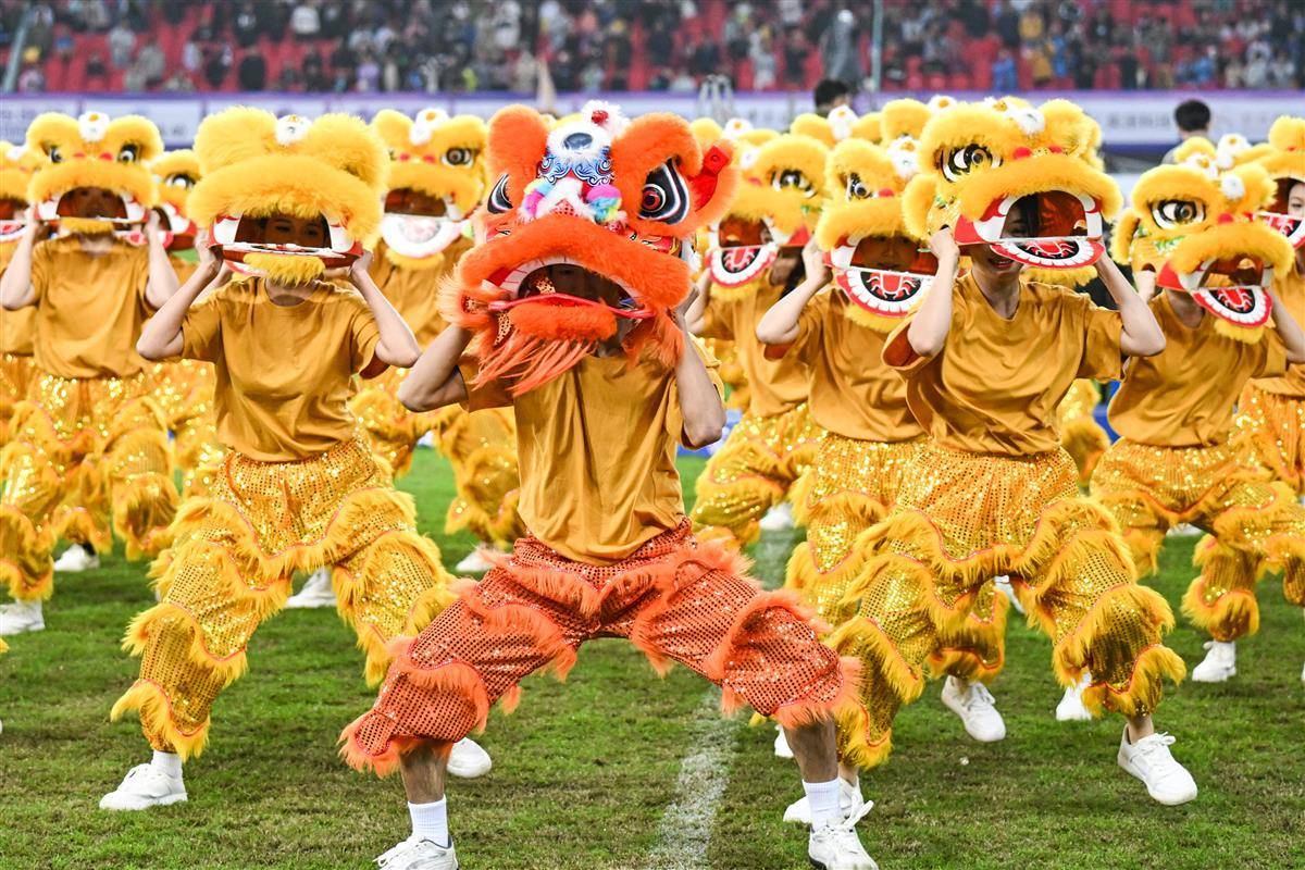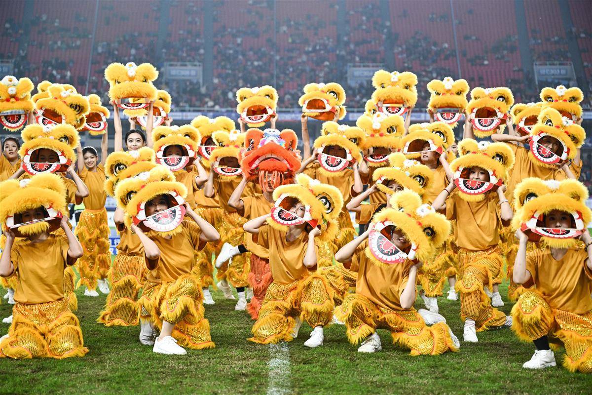 11月9日,在“汉超”颁奖仪式前,来自武汉体育学院艺术学院的学生代表们为现场球迷带来舞狮《福满金秋》,引来现场球迷阵阵欢呼。(湖北日报全媒记者 任勇 通讯员 宋善金 黄弋珂 摄)