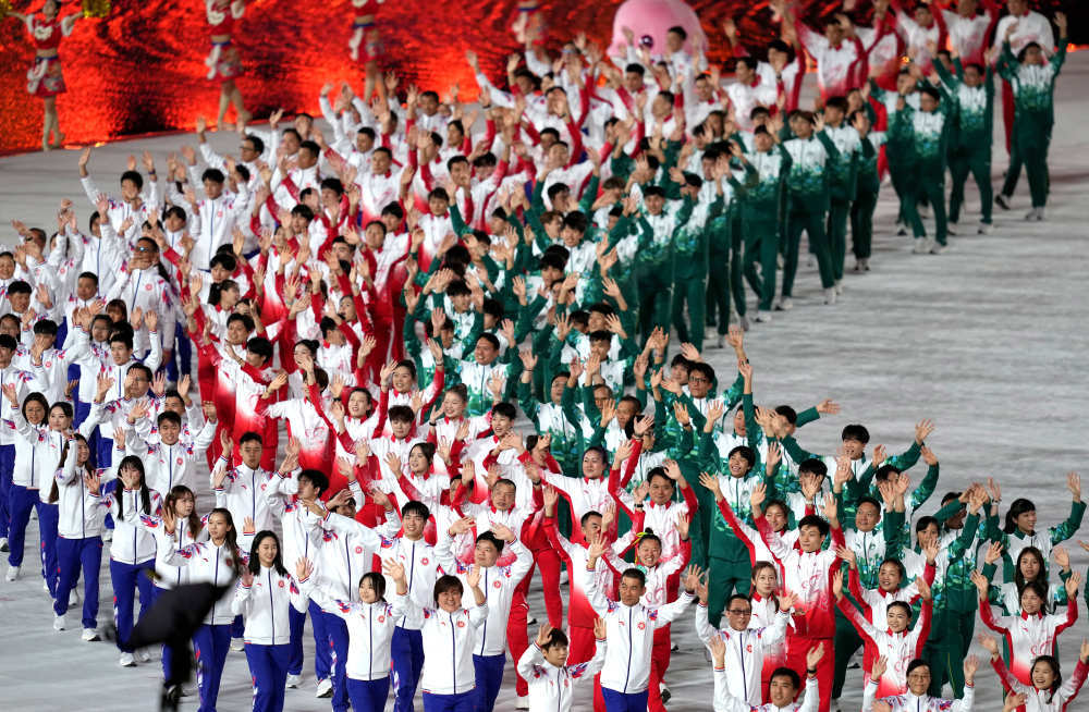 广东省体育代表团、香港特别行政区体育代表团、澳门特别行政区体育代表团在入场仪式上共同入场。新华社记者 赖向东 摄