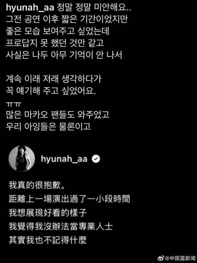 11月9日晚,韩国女歌手泫雅就晕倒一事在社交平台上发文向粉丝致歉并报平安,称“其实我也不记得什么”。
