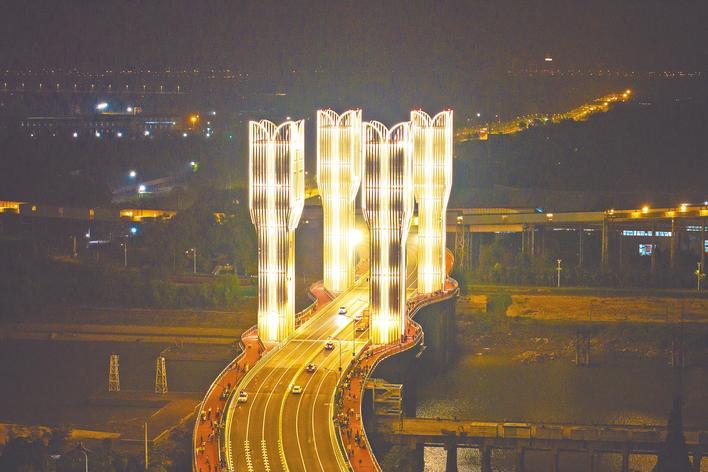 11月8日晚,位于青山区的武汉首座升降桥——右岸大道开启桥灯火辉煌,4根桥梁升降立柱在夜幕中十分耀眼,吸引不少市民前来打卡拍照。