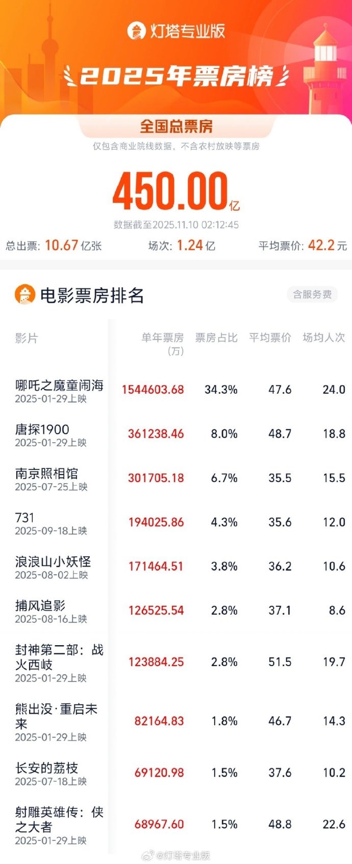 据网络平台数据,截至11月10日7时17分,2025年电影票房(含预售实时)已达450亿。
