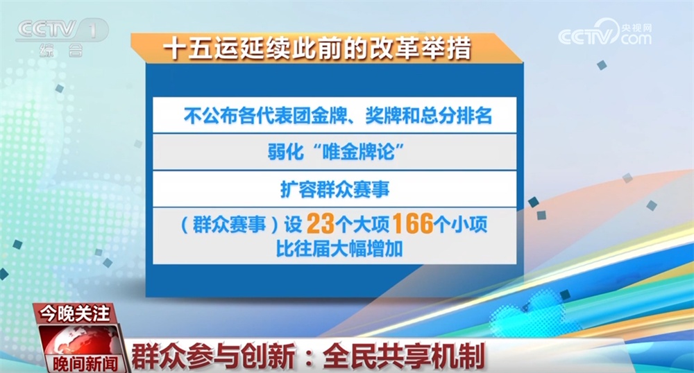 十五运延续此前的改革举措,不公布各代表团金牌、奖牌和总分排名,弱化“唯金牌论”,同时扩容群众赛事,设23个大项166个小项,比往届大幅增加。