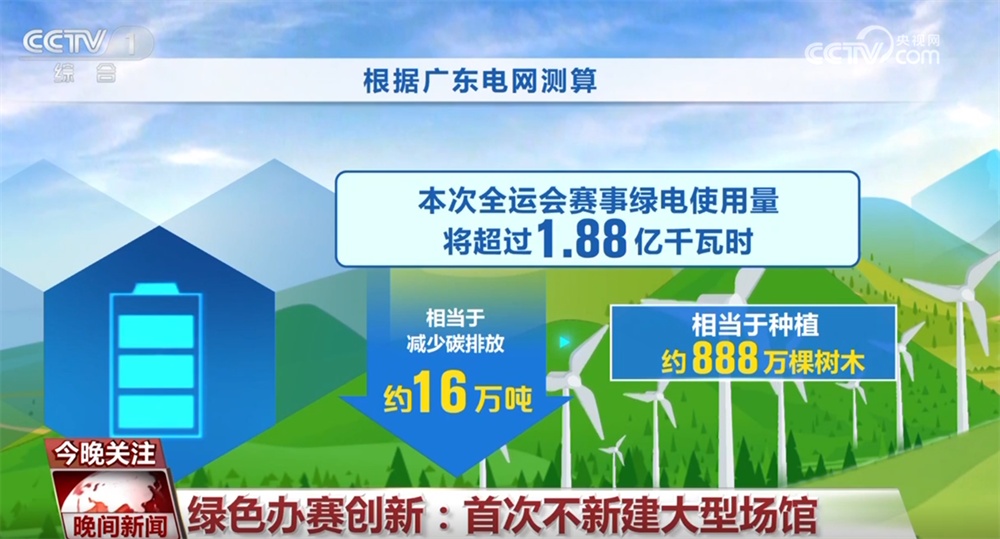 十五运优化场馆利用,90%以上竞赛场馆利用现有场馆改造升级,在全运会史上首次实现不新建大型场馆,有效降低了办赛成本。此外,根据广东电网测算,本次全运会赛事绿电使用量将超过1.88亿千瓦时,相当于减少碳排放约16万吨、种植了约888万棵树木。
