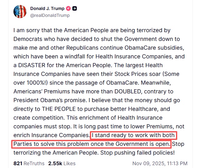 11月9日,美国总统特朗普再次在社交媒体上发帖,批评民主党人的医保政策,并坚持其先重开政府,再与民主党人讨论医保问题的立场。