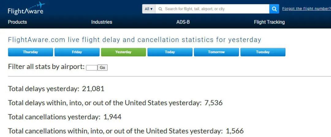 美国航班跟踪网站(Flightaware)统计的8日全天美国延误及取消航班数据。