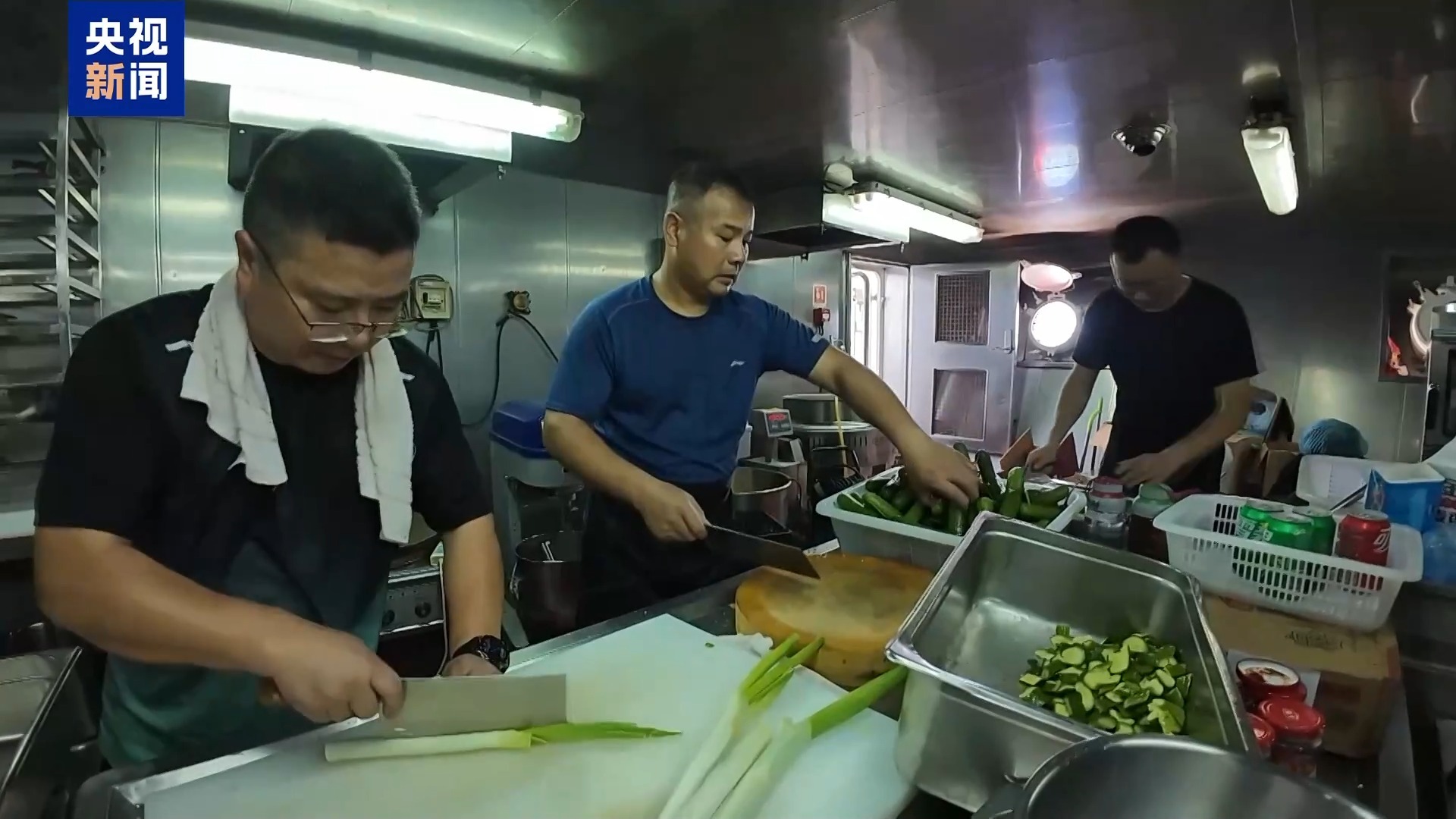 在厨房里,记者与来自其他单位的几位队员,一起帮着择菜、清洗厨具。六七名厨师也在不停地忙活着,炸鱼、剁肉、拌凉菜。厨房的小白板上写着当天的菜单,有盐焗鸡、冬瓜排骨、蒜薹炒肉、胡辣汤等。丰盛的中华美食,也让刚从晕船反应中恢复过来的队员们,有了补充体能的机会。