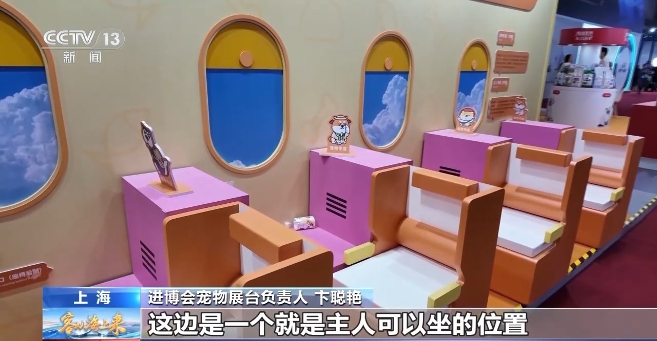 进博会宠物展台负责人 卞聪艳:整个的500平的这个地方,我们其实是采取了一个航站楼的概念,因为现在其实除了可以高铁携宠之外,我们还是可以把宠物和我们一起带入机舱里面。