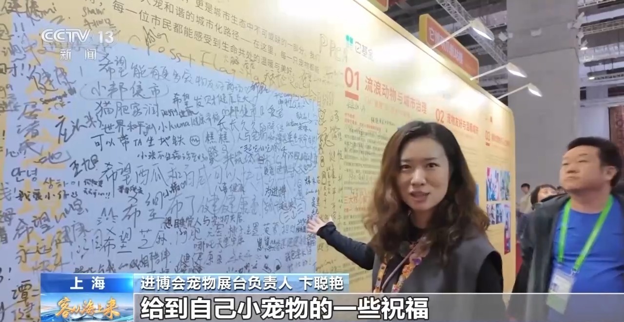 进博会宠物展台负责人 卞聪艳:当时我们想留一面墙。现在养宠物的人比较多,希望大家可以对自己的宠物写一些祝福的话。开展第二天我发现这边写得密密麻麻的,都是这些铲屎官给到自己小宠物的一些祝福。